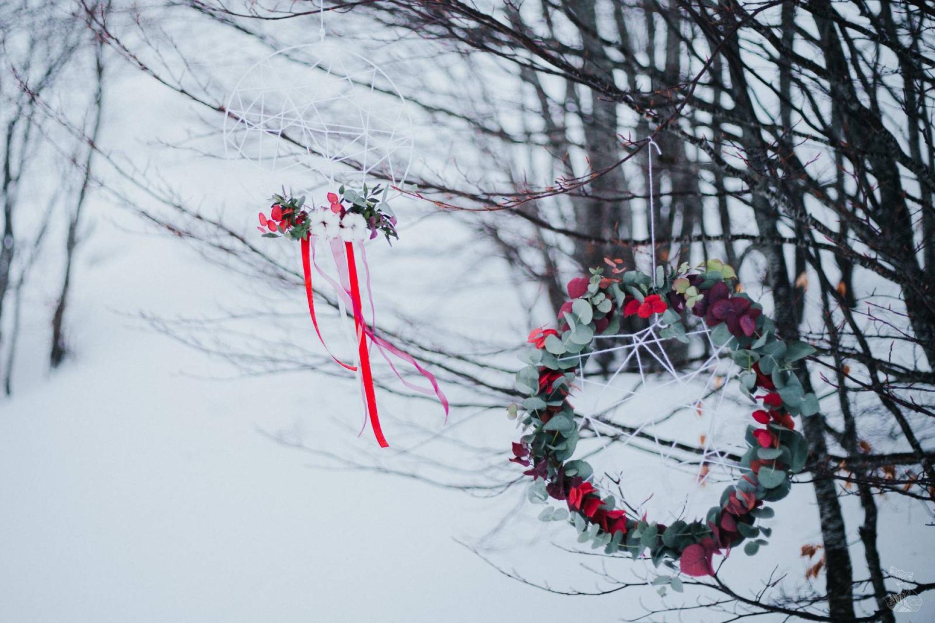 Imaginez une toile de fond de neige à perte de vue, un paysage resplendissant de blanc sublimé par une décoration florale somptueuse. Des touches de rouges Amour et d'eucalyptus se fondent harmonieusement dans le paysage hivernal, créant une esthétique visuelle à couper le souffle !