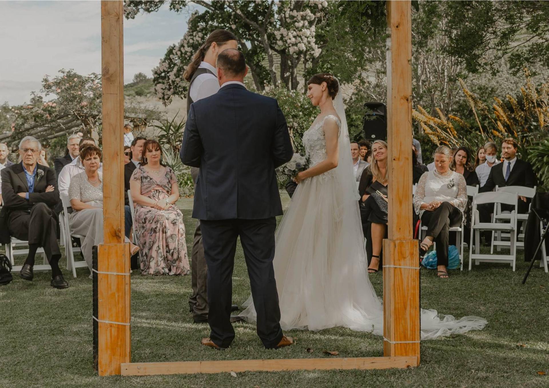 Pour une cérémonie laïque en plein air, dans votre jardin, imaginez une arche en bois, décorée d’un tissu, retombant sur le sol et d’une jolie composition florale, élaborée avec vos fleurs préférées.